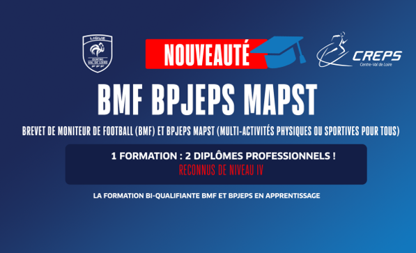 Cette nouvelle formation en apprentissage vous permet d’obtenir deux diplômes reconnus dans le secteur sportif de niveau 4 : LE BMF (Brevet de Moniteur de Football) BPJEPS MAPST (Brevet Professionnel de la Jeunesse, de l’Education Populaire et du Sport Multi Activités Physiques ou Sportives pour Tous).
